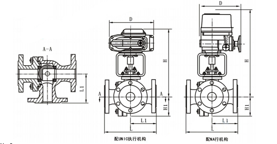 主要由阀体、阀杆、球芯、阀座、填料压板等主要零部件组成。标准球芯有L型三通双口孔道和T型三口孔道两种,改变球芯与管道的相对角度,可以对三支管道流体实现不同的组合控制:T型孔道可起分流合流作用,L型孔道起配比作用,适用于液体、气体、蒸汽等介质的配比调节与控制。