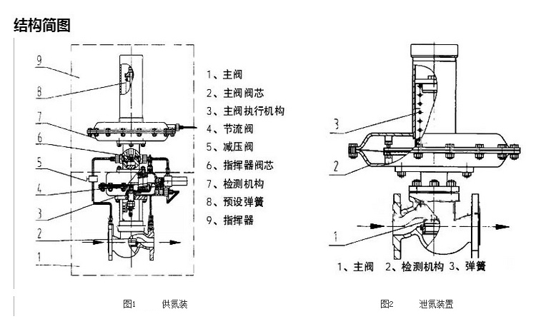 氮封装置结构(见图四),将设在罐顶的取压点的介质经导压管引入检测机构(7)、介质在检测元件上产生一个作用力与弹簧(8)、预紧力相平衡。当罐内压力降低至低于供氮装置压力设定点时,平衡破坏,使指挥器阀芯(6)打开,使阀前气体经减压阀(5)、节流阀(4)、进入主阀执行机构(3)上、下膜室,打开主阀阀芯(2)、向罐内充注氮气;当罐内压力升至供氮装置压力设定点,由于预设弹簧力,关闭指挥器阀芯(6)、由于主阀执行机构中弹簧作用,关闭主阀,停止供氮。