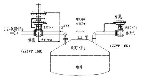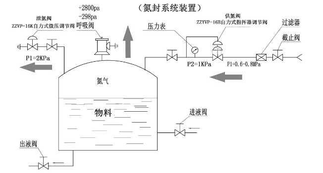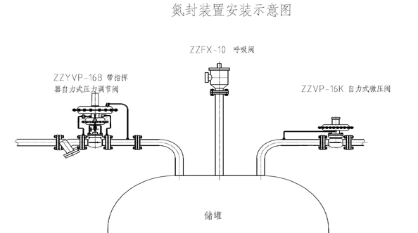氮封装置自力式微压力控制调节阀,主要用于保持容量顶部保护气(一般为氮气)的压力恒定,以避免容量内物料与空气直接按触,防止物料挥发、被氧化,以及容器的安全。特别适用于各类大型储罐的气封保护系统。该产品具有节能、动作灵敏、运行可靠、操作与维修方便等特点。氮封阀被广泛应用于石油、化工等行业。 氮封装置是由供氮装置(见图一)和泄氮装置(见图二)两部分组成。供氮装置由指挥器和主阀两部分组成;泄氮装置由反馈的压开型微压调节阀组成。氮气压力一般设为100mmH2O,通过氮封装置控制。